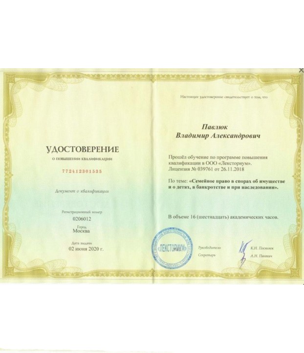 Наш юрист по семейным делам имеет не только высшее юридическое образование и большой опыт, но и государственное удостоверение о повышении квалификации по семейным делам у профессора Егорова А.В. (в г. Москва)